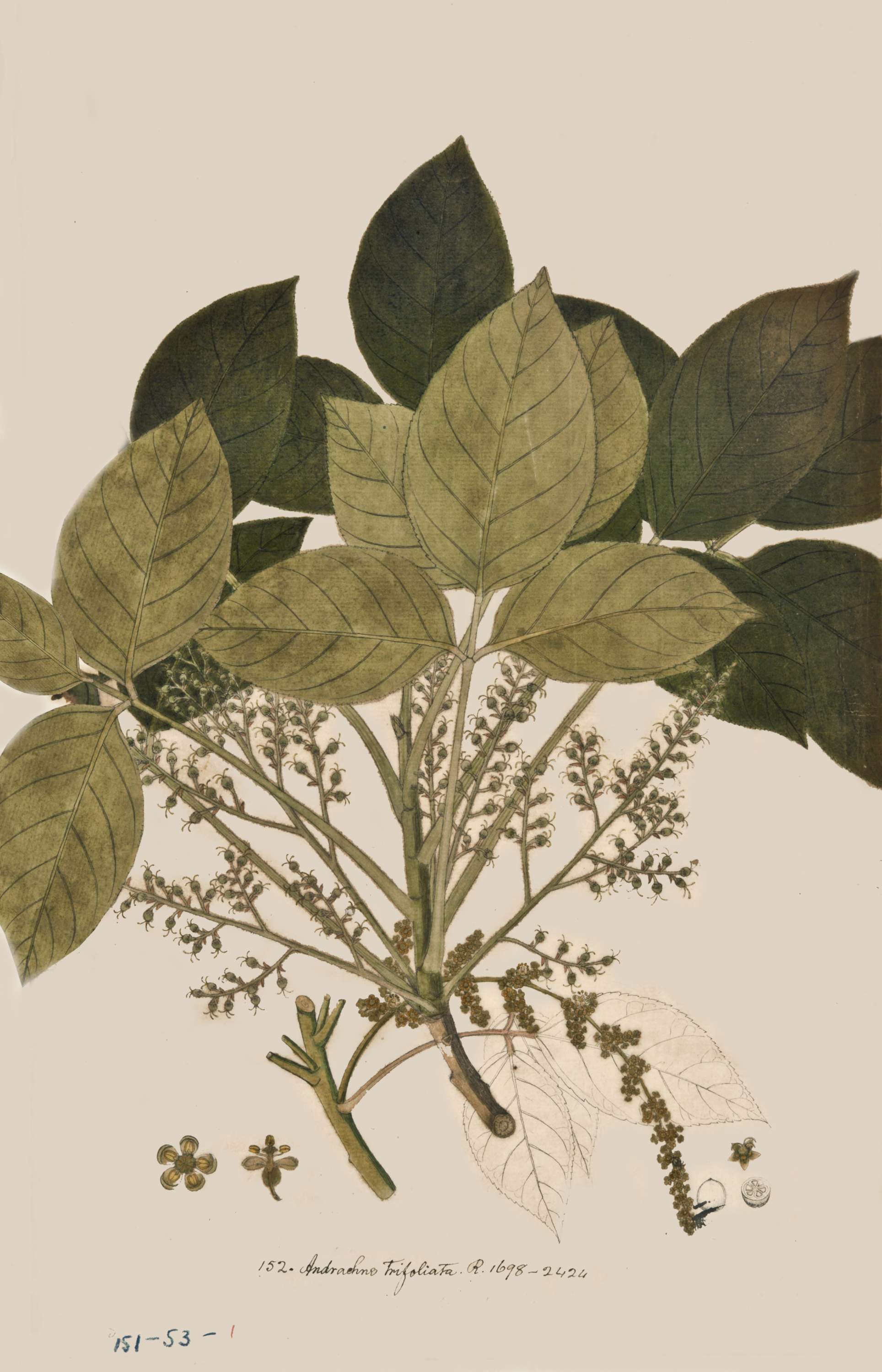 Move your mouse over image to enlarge. Category: Roxburghs Icon Volume/Folder Number: 25 Roxburghs Icon No.: 1698-2424 Name of the plant: Andrachne trifoliata Roxb. Name of the Family: EUPHORBIACEAE